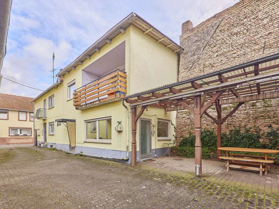 Großzügiges Anwesen mit 2 Wohnhäusern und Nebengebäude, Hofbereich und großem Gartengrundstück in Heuchelheim-Klingen. ++ Wohnhaus 1 - ca. 138 m² Wfl. ++ Die Bauweise ist massiv, unterkellert und mit einer Satteldachkontruktion mit Ziegeleindeckung versehen. Die Wärmeversorgung erfolgt über eine Gaszentralheizung. Warmwasser erfolgt über Elektrodurchlauferhitzer. Das Wohnhaus unterteilt sich im EG in einen Dielenbereich mit Garderobe und Gäste WC, eine Küche mit Speisekammer, ein Esszimmer und ein Wohnzimmer mit Zugang zum Freisitz. Das OG bietet einen Flurbereich, einen Balkon, 3 Schlafzimmer und ein Tageslichtbad mit Badewanne und Dusche. Im Speicher steht entsprechender Stauraum zur Verfügung. Der Keller gliedert sich in einen Vorraum, einen Heizraum und einen Lagerraum. ++ Wohnhaus 2 - ca. 97 m² Wfl. ++ Die Bauweise ist massiv, teilunterkellert und mit einer Satteldachkontruktion mit Ziegeleindeckung versehen. Die Wärme- und Warmwasserversorgung erfolgt über eine Gaszentralheizung. Das Wohnhaus unterteilt sich im EG in einen Dielenbereich, eine Küche mit Speisekammer, ein Wohnzimmer und ein Tageslichtbad mit Badewanne, Dusche und WMA. Das OG gliedert sich in einen Flurbereich, 2 Schlafzimmer, ein WC und einen Abstellraum. Der Keller bietet 2 Lagerräume. Das Dach wurde 2010 erneuert. Eine Halle mit ca. 70 m² Nfl. , Stellplatzfläche im Hof und ein großes Gartengrundstück ergänzen das Angebot. ++ Wohnhaus 2 ist aktuell für 1.000,00 € mtl. vermietet. ++